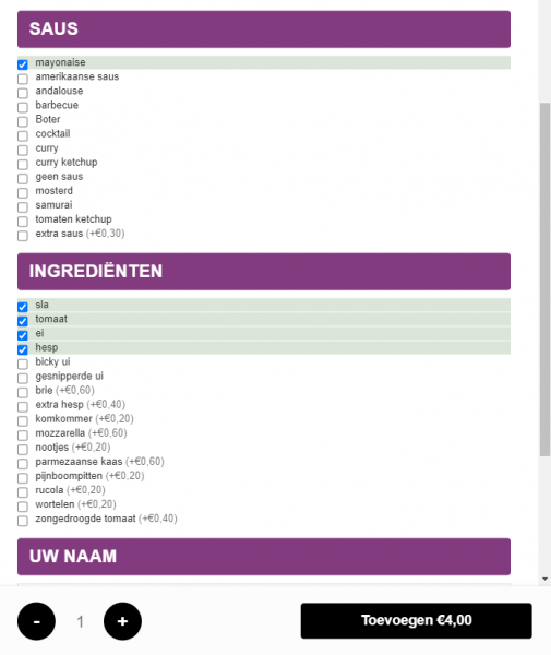 Daarnaast is er nog de mogelijkheid om bijpassende ingrediënten toe te voegen of te wijzigen. Je stelt je broodje dus zelf samen.